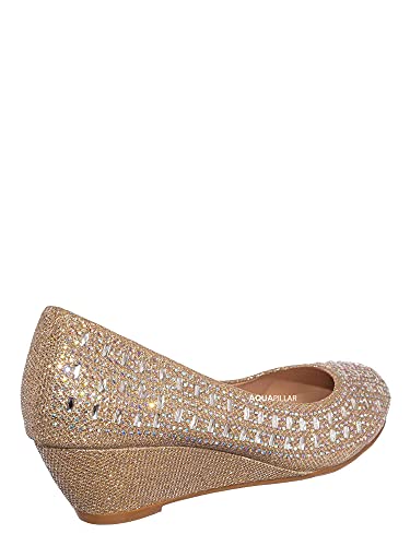 • These party dress pump features a mesh glitter upper, asymmetrical rhinestone array embellishment, rounded toe, low wedge, lightly padded insole. Some customer reported that they need half (0.5) size bigger than normal All Synthetic Material