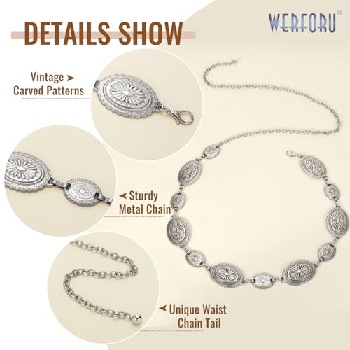 HOT ! WERFORU Western Chain Belt for Women Metal Chain Belt Metal Concho,A-silver,Fit Waist Size 39"-45"