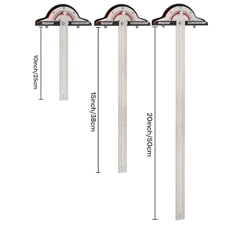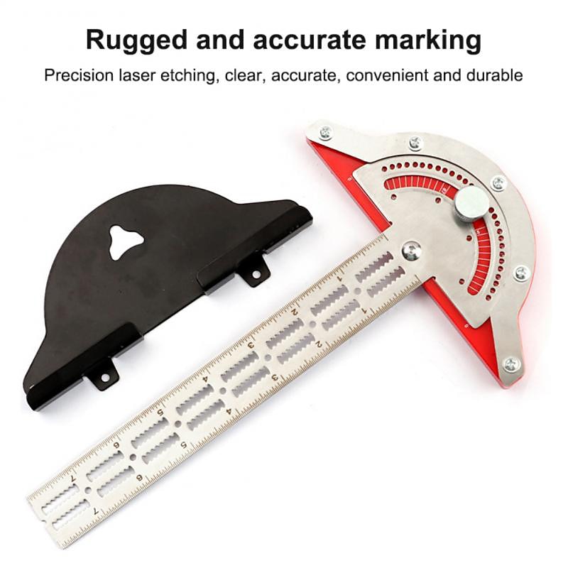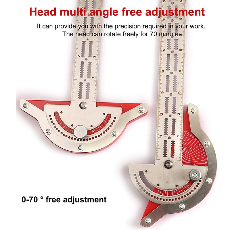 Highlights Key Selling Points: 1. Multifunctional device for length measurement and angle drawing. 2. Measures lengths and draws parallel lines at different angles and intervals. 3. Clear reading and convenient to use. 4. Accurate smallest scale of 1/32in. 5. 104 serrated notches and 13 circular holes for precise measurements. 6. Adjustable ruler tool from 0° to 70° at 5° intervals. 7. Integrated functions like measurement, angle drawing, and line drawing. 8. Made of hard plastic dial, stainless steel body (moisture-proof, rust-proof, corrosion-resistant). 9. Clear and precise laser scale that does not fade. 10. Equipped with a wall-mounted storage rack for convenient storage. 11. Indispensable tool for woodworkers and mechanics.