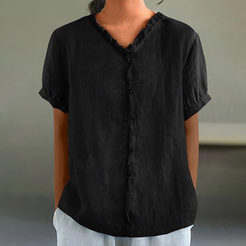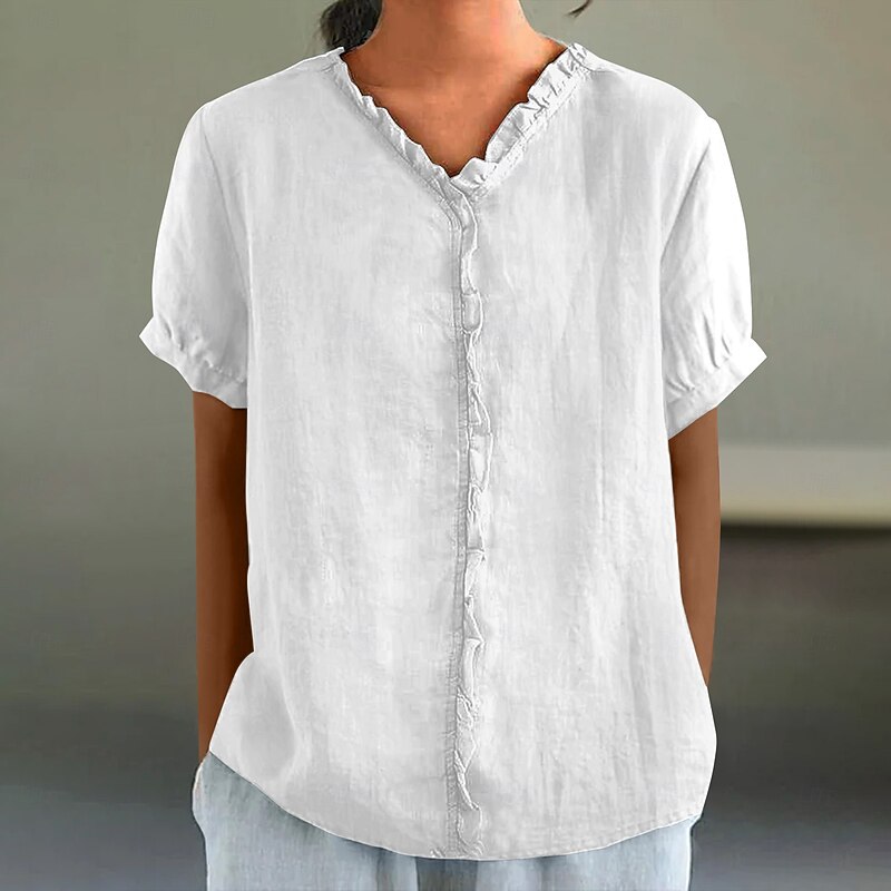 More information about Women's Cotton Linen Blouse Solid Color Elegant Casual Short Sleeve V Neck Regular Tops Daily Holiday Pleated Black White Pink Purple Green Summer