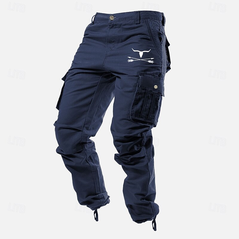 Highlights [Fabric] : Constructed from 100% high-quality cotton, these men's cargo pants offer a breathable and comfortable experience. The fabric's micro-elasticity ensures ease of movement, making them perfect for both outdoor activities and casual wear. [Fit Type] : Designed with a regular fit, these cargo pants provide ample room for movement, ensuring comfort and flexibility throughout the day. The mid-waist design offers a classic and secure fit. [Design Highlights] : Featuring a multi-pocket design, these pants are equipped with large side cargo pockets for practical storage. Reinforced stitching enhances durability, while drawstring cuffs at the ankles allow for an adjustable fit. The pants also boast a distinctive graphic cow pattern for a unique touch. [Occasions] : Ideal for sports, outdoor activities like camping and hiking, as well as casual outings. These cargo pants are versatile enough for various leisure and adventure settings, matching well with different styles thanks to the khaki, blue, yellow, and army green color options. [Size Range] : Available in sizes 30, 32, 34, 36, and 38, these cargo pants cater to a wide range of customers, ensuring a comfortable fit for different body types.