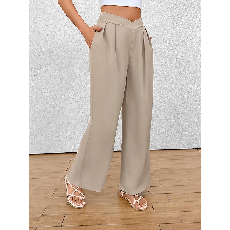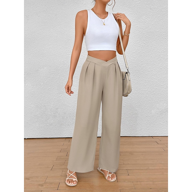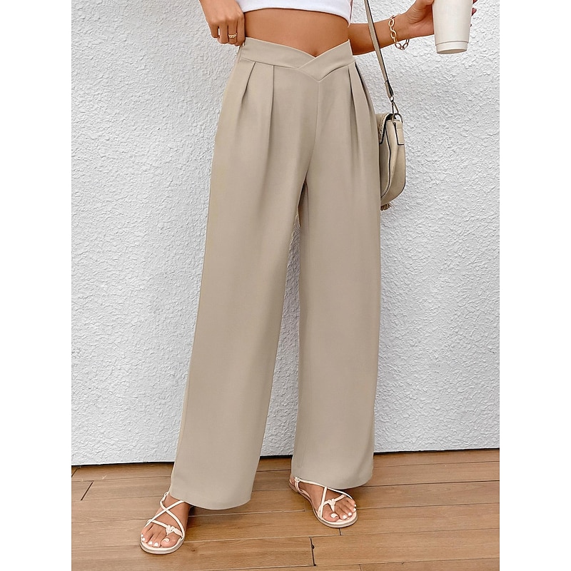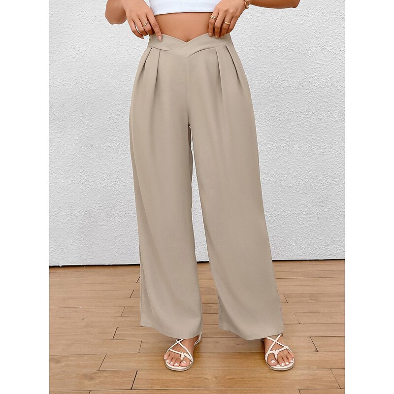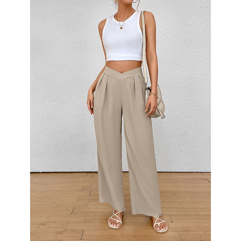 Highlights [Fabric & Fit] : Crafted from a premium blend of polyester, these women's wide-leg pants provide a soft, micro-elastic feel for unparalleled comfort. The regular fit and high-rise waist contribute to a flattering silhouette, making these trousers both stylish and comfortable for daily wear. [Design Highlights] : The trousers boast a chic wide-leg design, enhanced by elegant pleats that add a sense of flow and grace to the overall look. The unique V-shaped waistband introduces a modern element, giving these pants a fashionable edge suitable for numerous occasions. [Occasions] : Perfect for spring and summer, these versatile pants can be effortlessly styled for both casual and formal settings. Whether you're dressing up for work or heading out for a relaxed weekend brunch, they pair beautifully with crop tops or blouses and can be complemented by either sandals or heels. [Size Availability] : Available in a range of sizes from S to 2XL, ensuring a suitable fit for a variety of body types. Select the perfect size to achieve your desired look and comfort level. [Practical Features] : The pants are designed for breathability and long-lasting comfort, making them an ideal choice for everyday wear. The plain pattern adds a touch of simplicity, allowing for easy styling with your existing wardrobe.