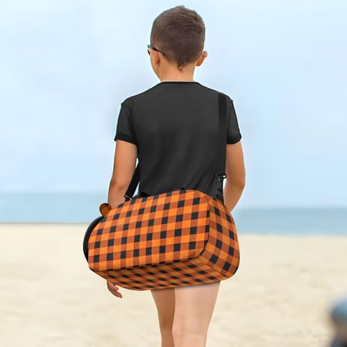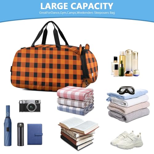 HOT ! Kids Sports Duffel Bag for Boys & Girls - Orange Plaid Pattern 100% Polyester Gym Bag with Separate Shoe Compartment, Adjustable Shoulder Strap, Compact Travel & Workout Gear Bag