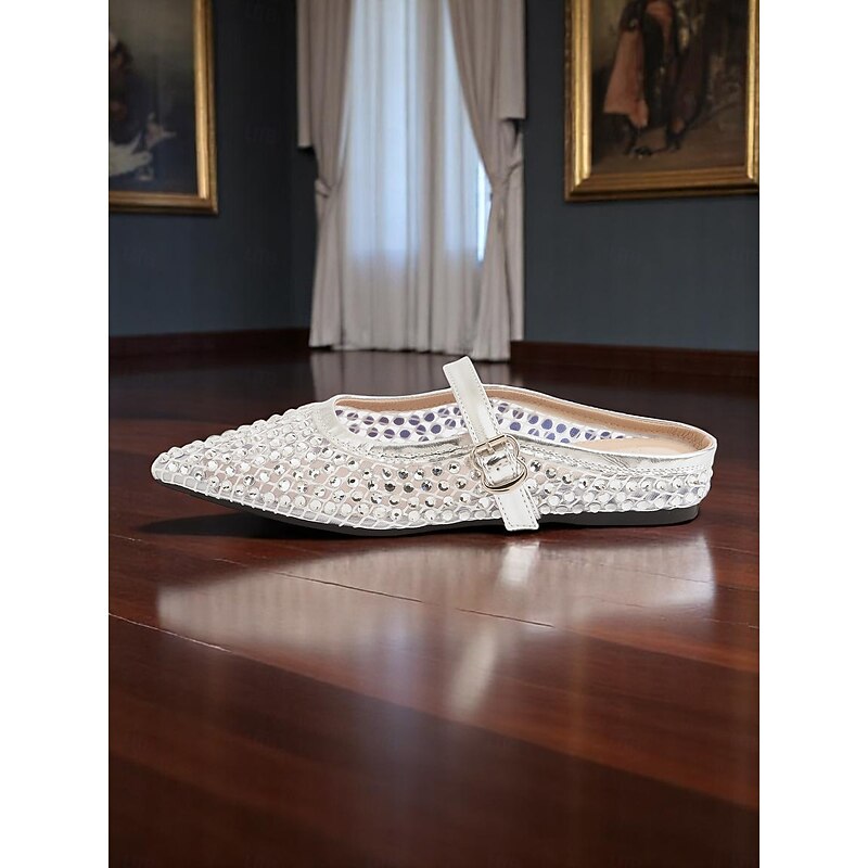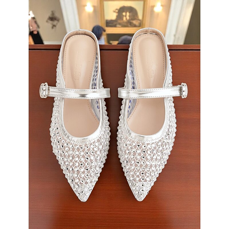 HOT ! Women's Silver Rhinestone Flat Mules - Sparkly Slip-On Mary Jane Shoes for Stylish Daytime Dates and Gallery Visits