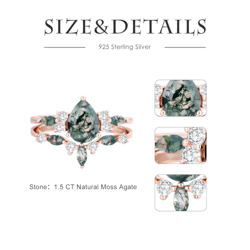 1.5 CT Natural Moss Agate Ring Set - Pear Shape Moss Agate and Moissanite Engagement Rings for Women - 925 Sterling Silver Art Deco Promise Wedding Bridal Set 6