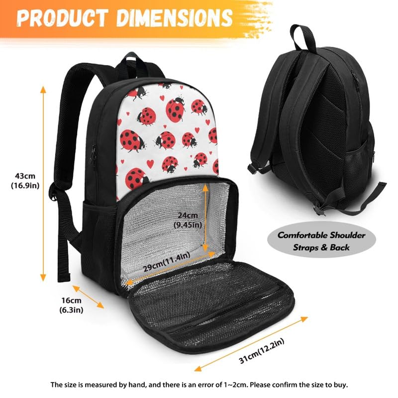 • 【Size and Quantity】Backpack: 11.4 inches * 6.3 inches * 16.9 inches (length * width * height). Lunch Bag: 11.4 inches * 6.3 inches * 9.45 inches (length * width * height). Due to different measurement methods, size data with errors within 1-2cm is a normal phenomenon.
