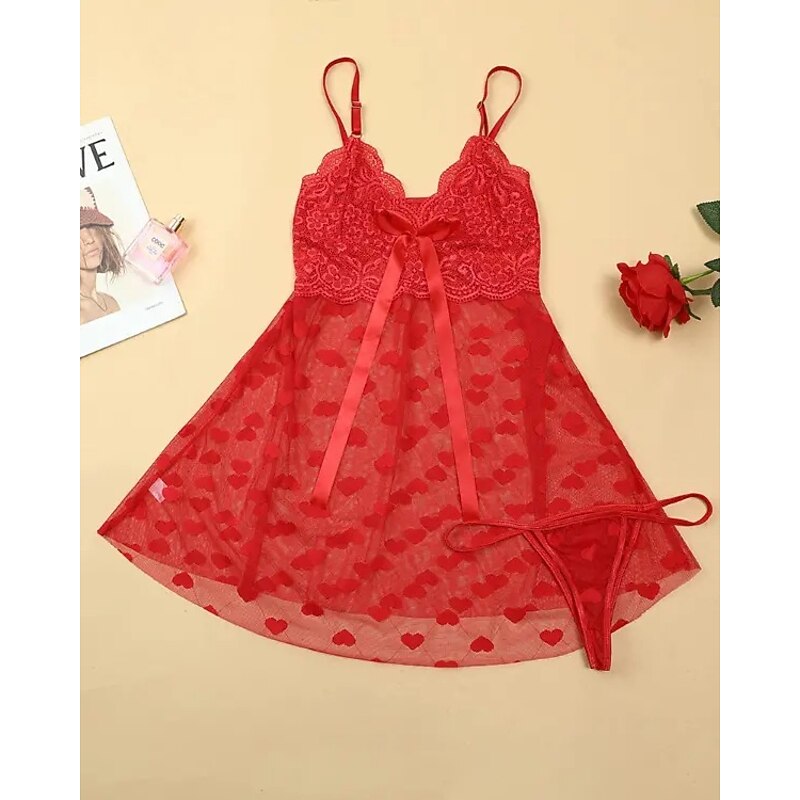 HOT ! Women's Valentine Night Dress Sexy Lingerie Lace Slip Dress Mini Dress Hollow Out Heart V Neck Lounge Red Home Outfits Date Night Outfit