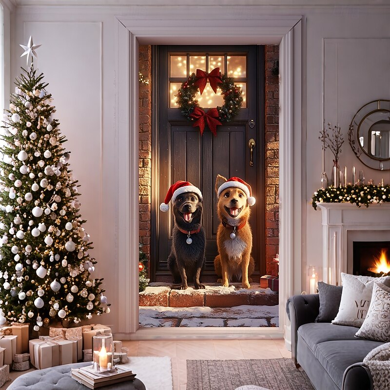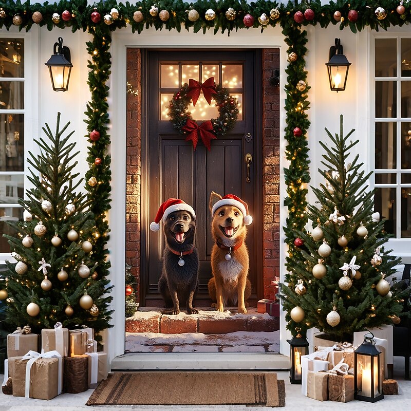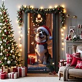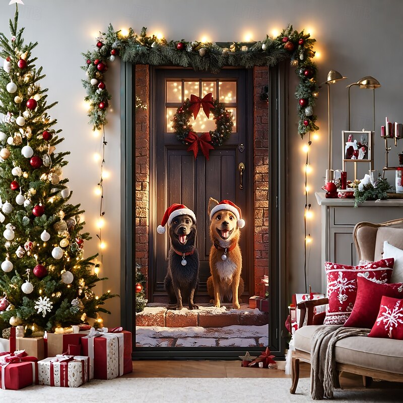 HOT ! Christmas Door Decorations Door Covers Cute Dog Door Tapestry Door Curtain Decoration Backdrop Door Banner for Front Door Farmhouse Christmas Holiday Party Decor Supplies Gift Indoor/Outdoor