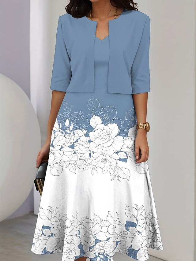 HOT ! Women's Two Piece Dress Sets Midi Dress with Jacket Elegant A Line Dress Half Sleeve Casual Semi Formal Ombre Floral Print V Neck Date Light Yellow Blue Green Regular Fit