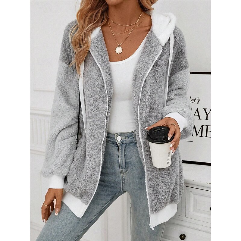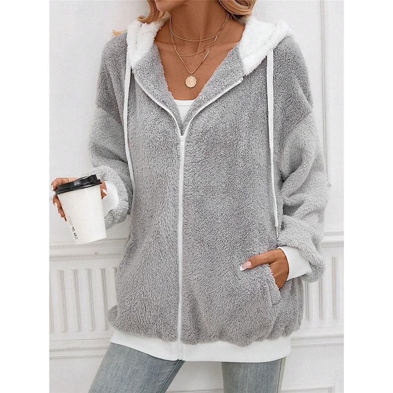 More information about Women's Teddy Coat Hoodie Jacket Outdoor Street Daily Wear Fall Winter Regular Coat Regular Fit Thermal Warm Breathable Stylish Casual Jacket Long Sleeve Plain with Pockets Full Zip Gray