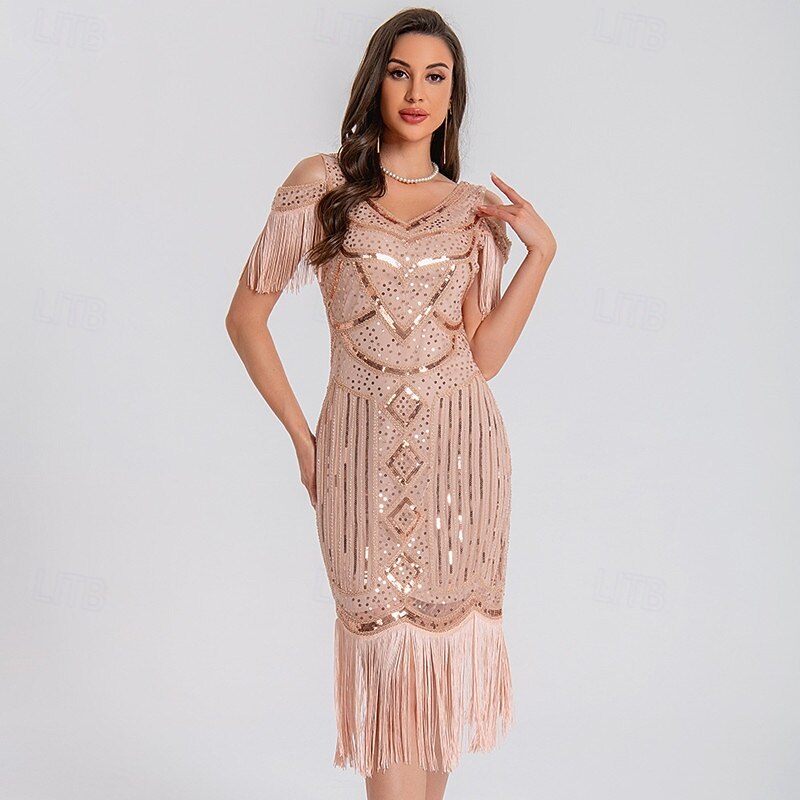 1920s Vintage Inspired Short Length Flapper Dress Party Costume The Great Gatsby Wedding Guest Sequins Sequin Tassel V Neck Fancy Dress Women's Christmas Halloween New Year Casual Daily Party 1
