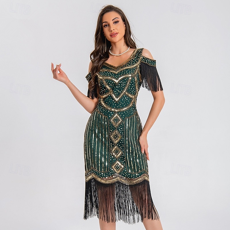 1920s Vintage Inspired Short Length Flapper Dress Party Costume The Great Gatsby Wedding Guest Sequins Sequin Tassel V Neck Fancy Dress Women's Christmas Halloween New Year Casual Daily Party 6