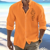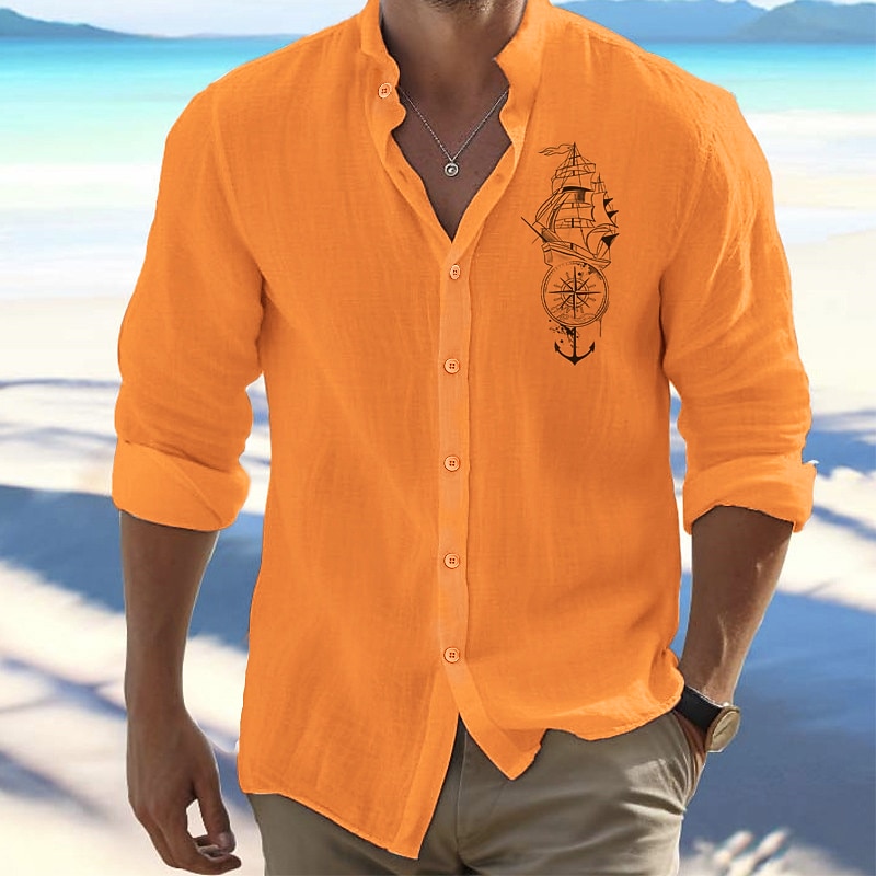 Highlights [Fabric] : Crafted from lightweight cotton, this men's shirt ensures breathability and comfort, perfect for spring and fall wear. The fabric's light and airy quality makes it ideal for warm weather and outdoor activities. [Fit] : Featuring a regular fit design, this shirt offers a relaxed silhouette that allows ease of movement, making it suitable for a variety of casual occasions. The long sleeves come with roll-up tabs, giving flexibility for adjustable sleeve lengths. [Design Highlights] : The shirt is adorned with a distinctive nautical-themed print, showcasing a compass and sailboat, adding an adventurous charm to the overall look. The standing collar provides a modern and stylish touch that sets it apart from typical beach shirts. [Occasions] : Ideal for daily wear, vacations, and outdoor adventures, this shirt effortlessly combines comfort with style. Whether you're strolling along the beach or attending a casual gathering, this shirt serves as a versatile piece to enhance your wardrobe. [Size Range] : Available in sizes S, M, L, XL, 2XL, and 3XL, the shirt caters to a wide range of body types, ensuring a comfortable fit for adults.