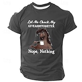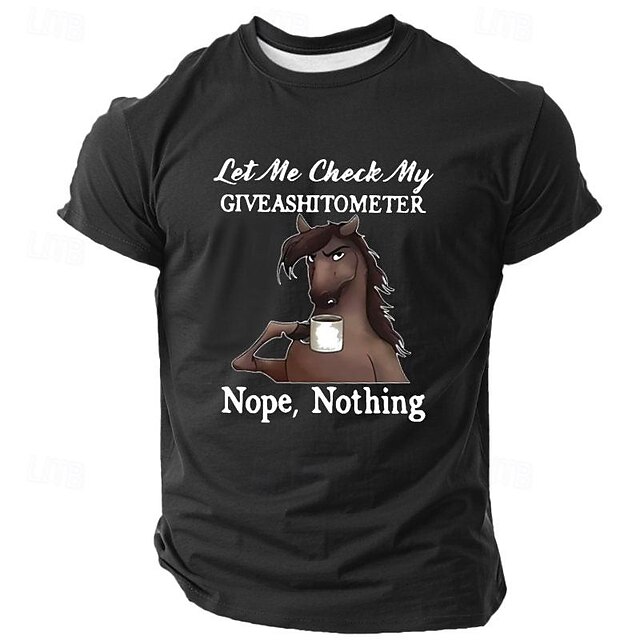 Highlights [Fabric] : The Men's Horse Funny T-shirt is crafted from high-quality polyester, which ensures comfort and breathability, making it ideal for the warmer months of spring and summer. [Fit] : This t-shirt features a classic crew neck with a tailored fit, providing a stylish yet relaxed silhouette suitable for casual streetwear and retro vintage style. [Design Highlights] : The t-shirt boasts a humorous 3D print design featuring a whimsical horse illustration paired with a witty quote. Its vibrant print stands out against the classic color options of blue, black, and gray, adding a playful yet fashionable element to your wardrobe. [Occasion] : Perfect for casual outings such as street walks, bar gatherings, or leisurely weekends. Its blend of style and humor makes it a versatile choice for various informal settings. [Size Range] : Available in a wide range of sizes from S to 3XL, catering to different body types and ensuring a comfortable fit for adult men.