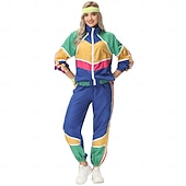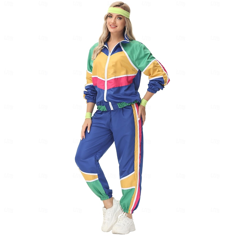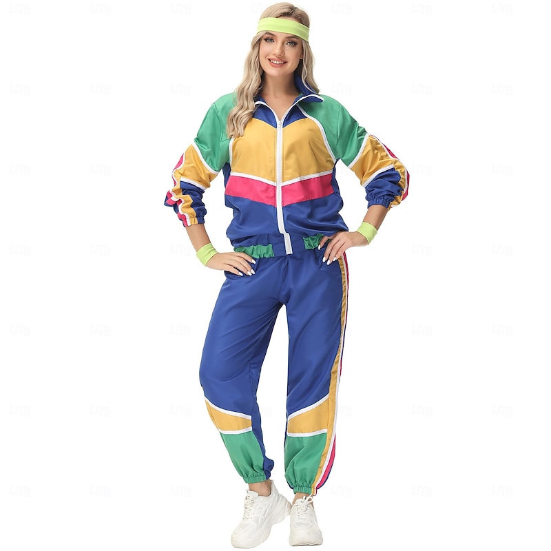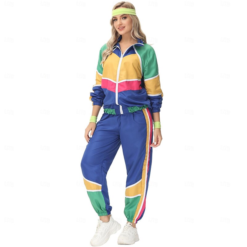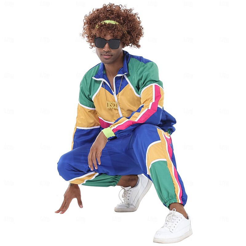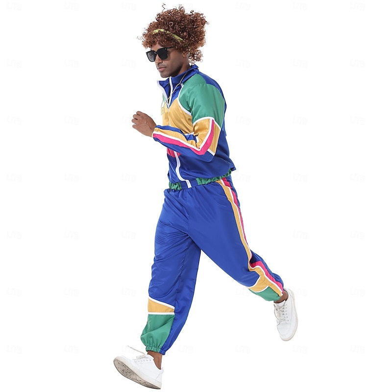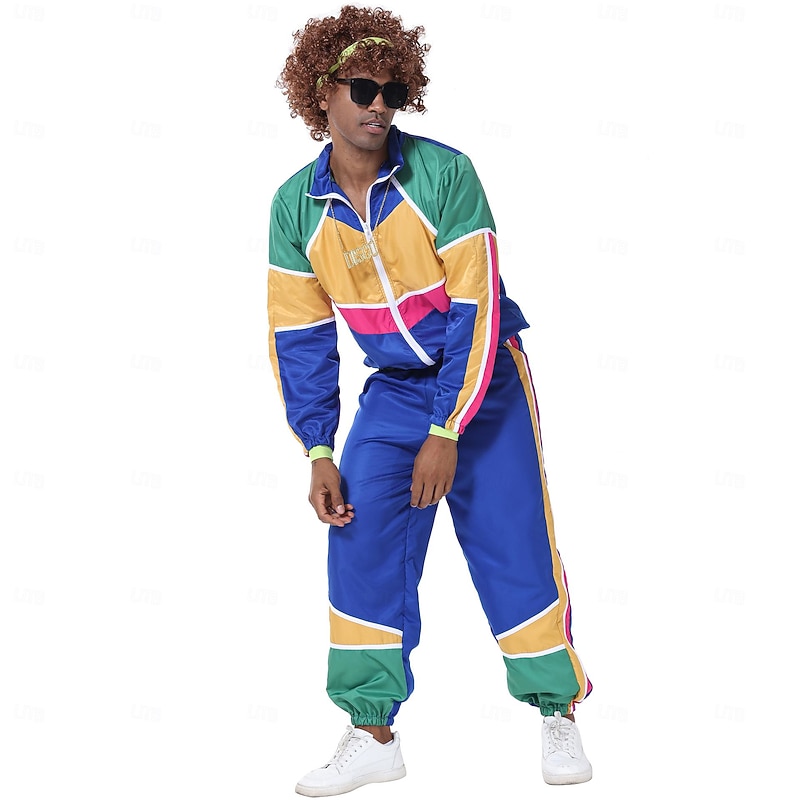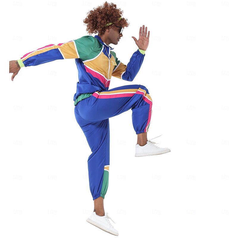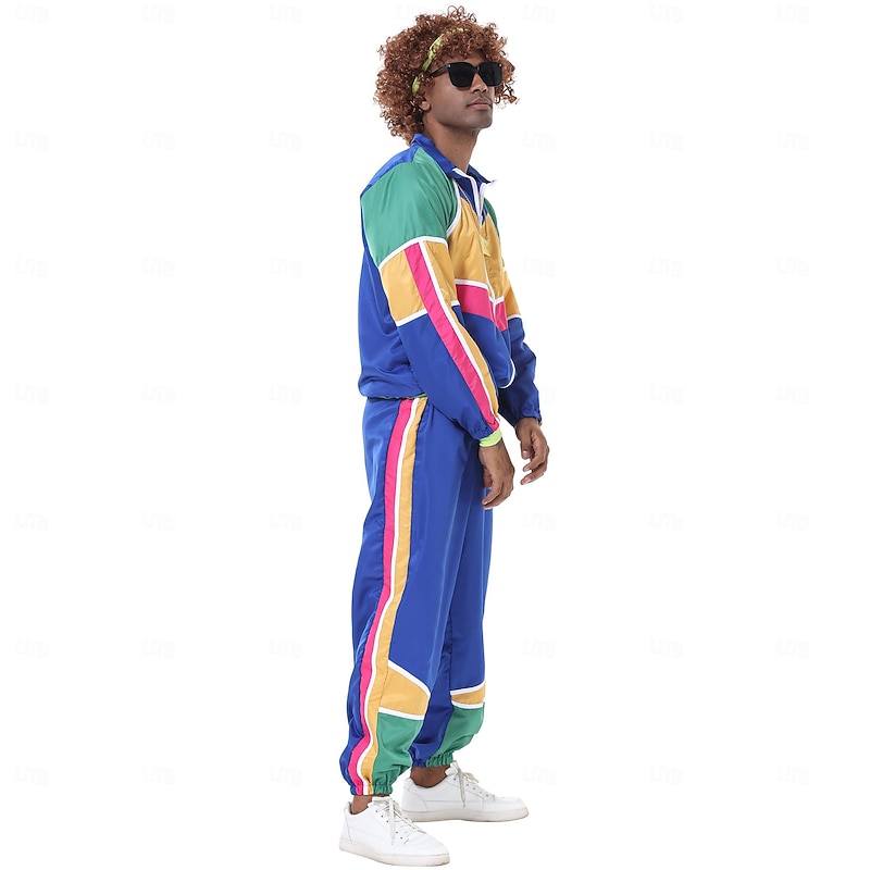 Highlights [Fabric] : Crafted from high-quality polyester, these vibrant tracksuits offer a lightweight and durable feel, ensuring both comfort and flexibility. [Fit] : Designed with a relaxed fit, these outfits provide optimal ease of movement, making them a great choice for any energetic activity. [Design Highlights] : Featuring a bold retro-inspired color-blocked pattern, the tracksuits incorporate eye-catching hues of yellow and other vibrant colors, capturing the quintessential 1980s vibe. The jackets are equipped with front zipper closures and elastic cuffs, while the pants boast an elastic waistband and cuffs for a snug fit. [Occasions] : Ideal for masquerade events, Halloween parties, carnival celebrations, or any occasion where you want to stand out with a funky, retro style. These outfits are perfect for casual outings or themed parties, helping you make a memorable statement. [Size Range] : Available in M and XL for both men and women, allowing for a comfortable fit across a range of adult sizes.