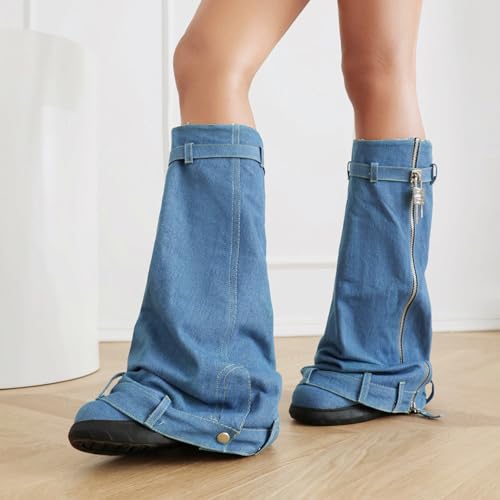 keleimusi Denim Lock Biker Boots Fold Over Knee High Jeans Boot for Women 7