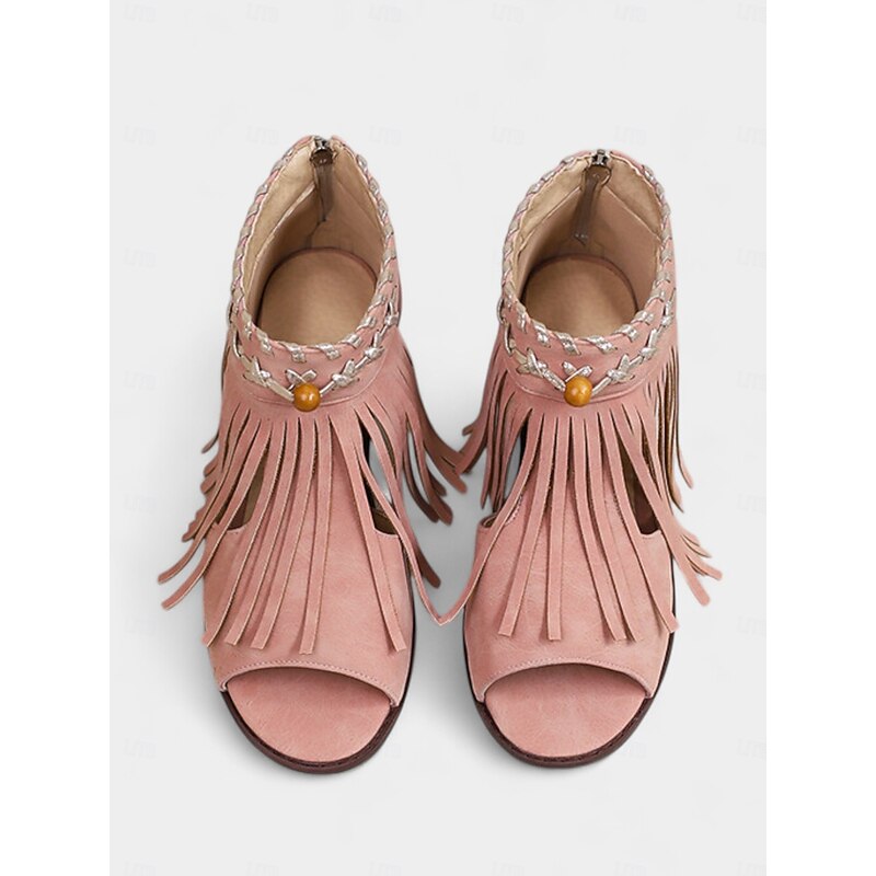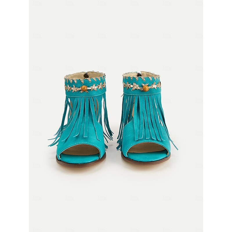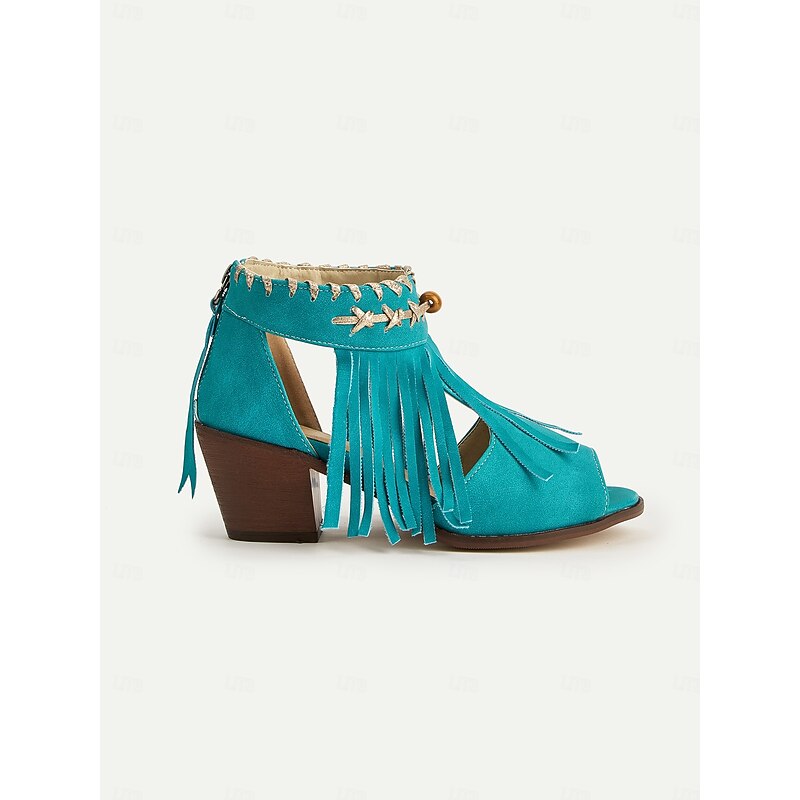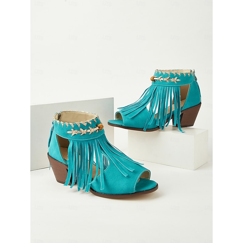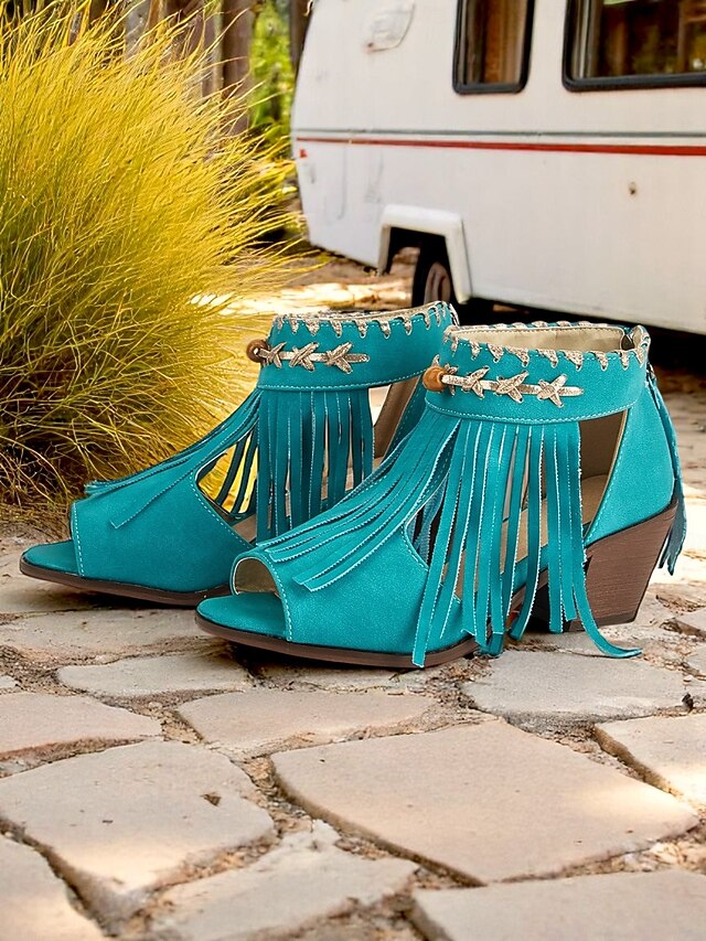 HOT ! Women's Blue Bohemiao Fringe Peep-Toe Sandals with Block Heels – Western Style Open Toe Summer Shoes for Music Festivals and Casual Outings