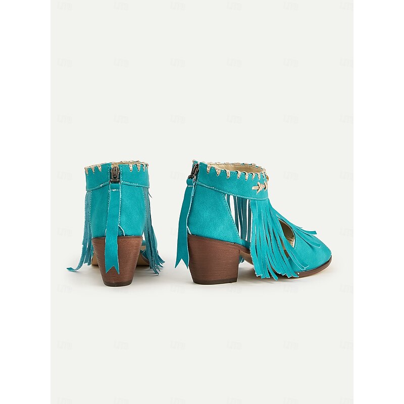 Women's Blue Bohemiao Fringe Peep-Toe Sandals with Block Heels – Western Style Open Toe Summer Shoes for Music Festivals and Casual Outings 4