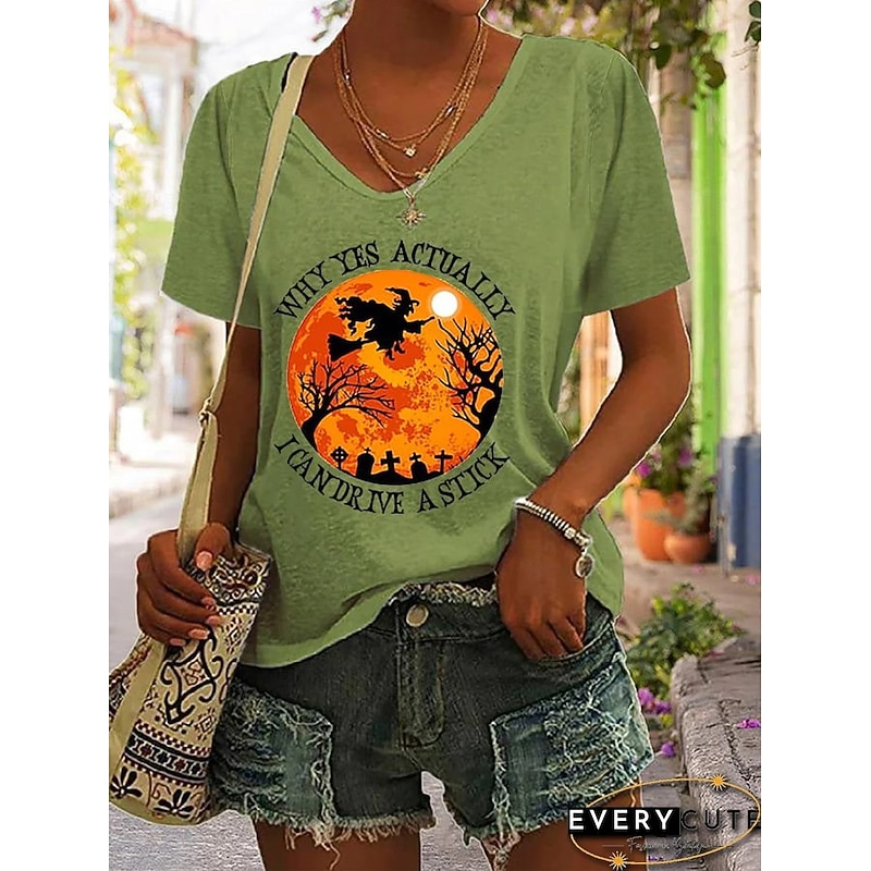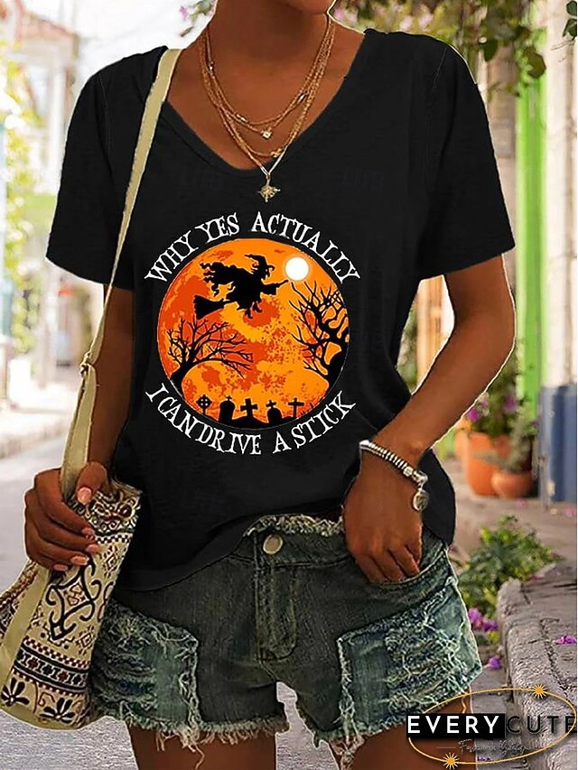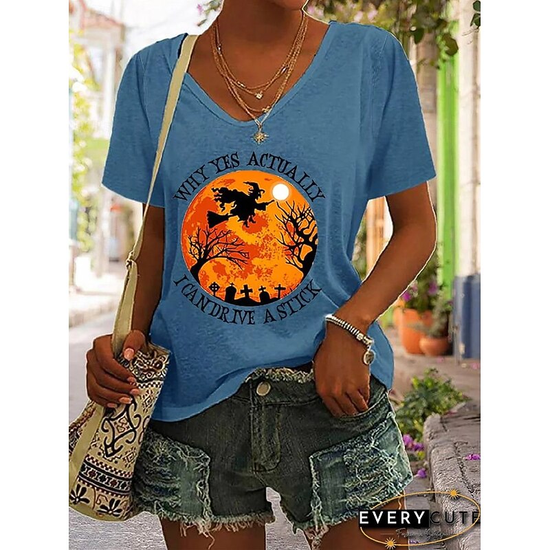 HOT ! Halloween Women's T shirt Witch Graphic Letter Vintage Stylish Classic Short Sleeve V Neck Regular Tops Daily Print Black White Blue Green Gray Summer Spring