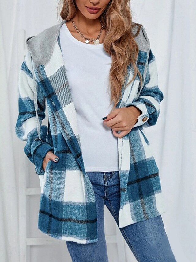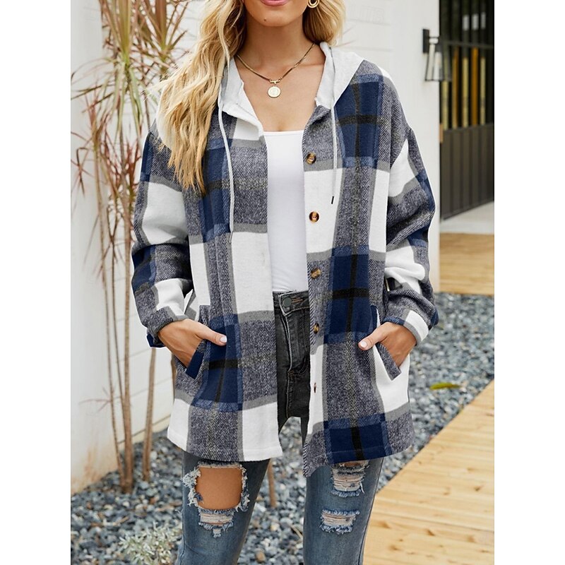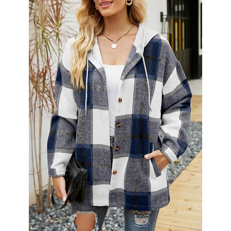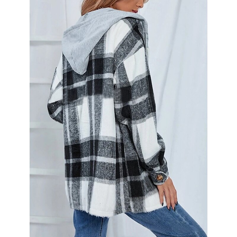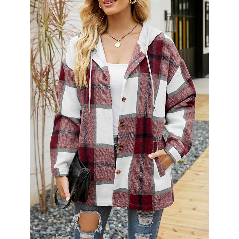 More information about Women's Casual Jacket Hoodie Jacket Comfortable Breathable Buttons Print Casual Plaid Vacation Street Casual Daily Wear Single Breasted Regular Hooded Loose Fit Long Sleeve Outerwear Black Wine Navy