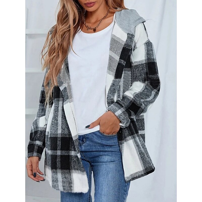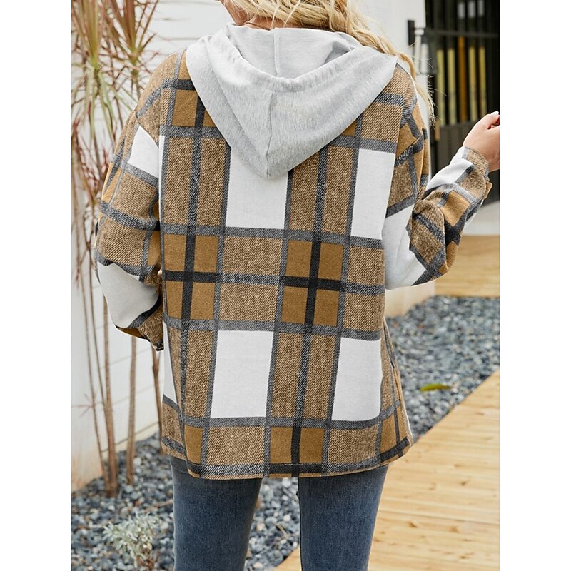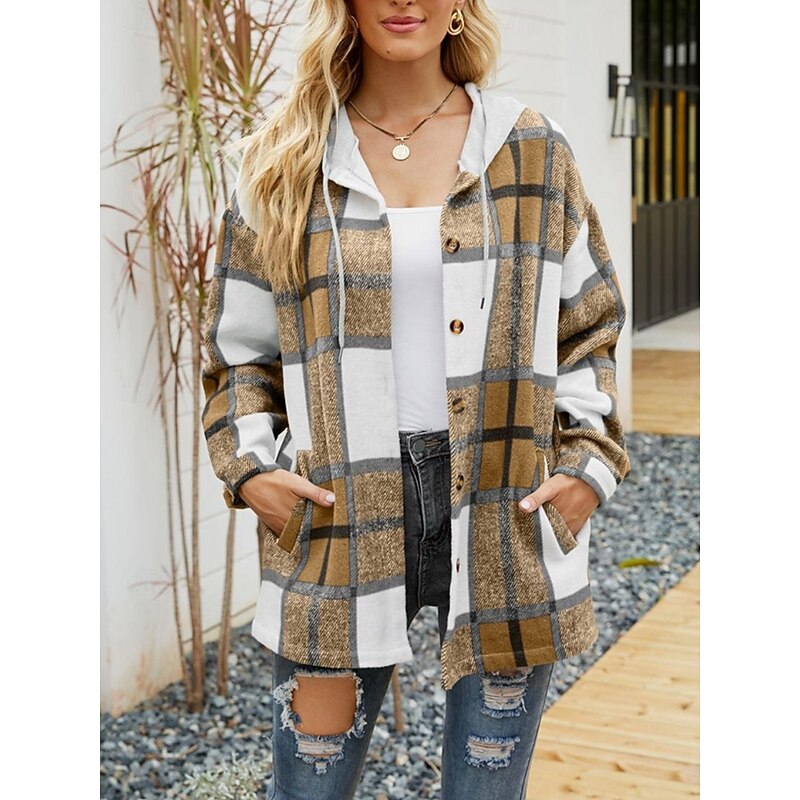Women's Casual Jacket Hoodie Jacket Comfortable Breathable Buttons Print Casual Plaid Vacation Street Casual Daily Wear Single Breasted Regular Hooded Loose Fit Long Sleeve Outerwear Black Wine Navy 25