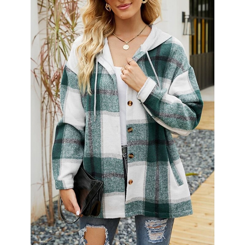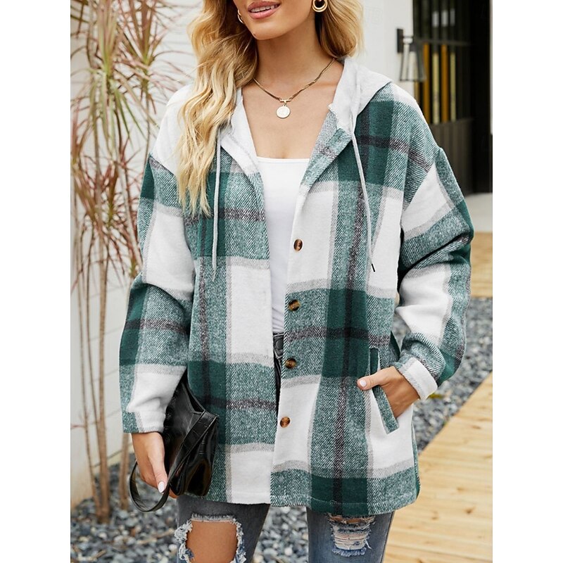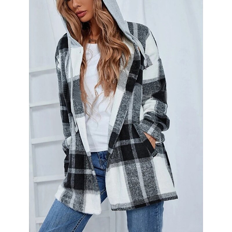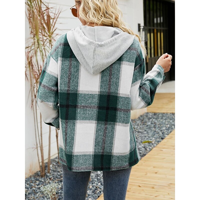 HOT ! Women's Casual Jacket Hoodie Jacket Comfortable Breathable Buttons Print Casual Plaid Vacation Street Casual Daily Wear Single Breasted Regular Hooded Loose Fit Long Sleeve Outerwear Black Wine Navy