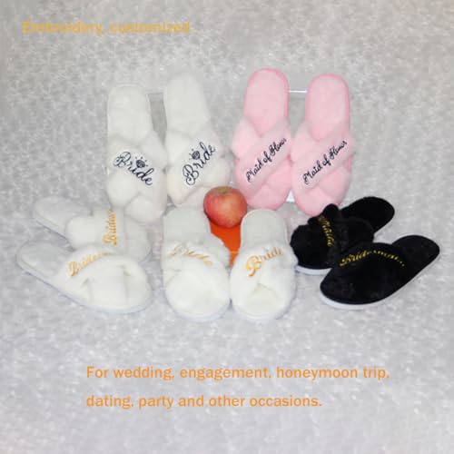 • Soft & Comfortable: The upper is made of synthetic fiber, which features delicate softness similar to natural rabbit fur, etc. 0.26 inch thick EVA sole. Bride and bridesmaid fonts are embroidered.