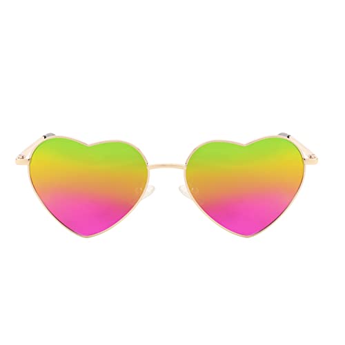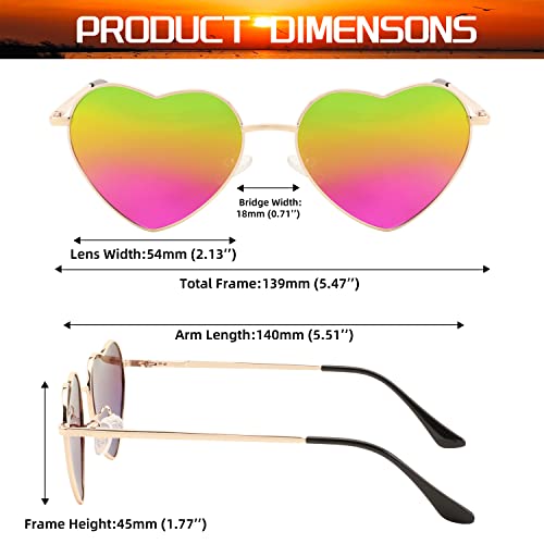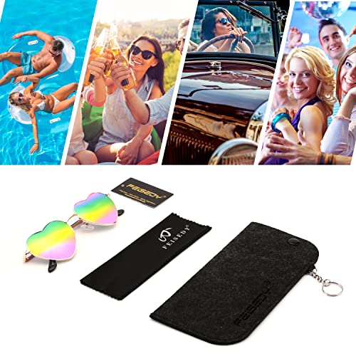 [Fashionable & Cute Design]- FEISEDY lovely fashionable heart-shaped sunglasses paired with exquisite metal frames, available in multiple good-looking colors. These make you look cooler and more charming on a sunny day![supreme Material] - FEISEDY vintage heart sunglasses lenses are made of premium PC material, scratch-resistant polarized lens with anti-glare coating, thin sturdy metal frame, gentle anti-skid nose pads, all these details ensure long-lasting use and comfort![ UV400 Protection Polarized Lens]- Use polycarbonate polarized lenses to protect the eyes perfectly, 100% block harmful UVA and UVB rays, restore real color, eliminate reflection and scattered light.[Product Dimensions]54 mm ( 2.13inch) of lens width, 45mm ( 1.77inch) of lens height, 139mm (5.47inch) of temple length, 18mm ( 0.71inch) of nose bridge, and 140mm ( 5.51inch) of overall frame width.[Suitable Occasions]- Wearing heart-shaped love sunglasses can immerse your eyes in the colorful world. This is an excellent and ideal gift! Suitable for birthday parties, family gatherings, travel, outdoor picnics or daily use. Perfect for everyday use. High quality materials and excellent craftsmanship ensure long-lasting durability.