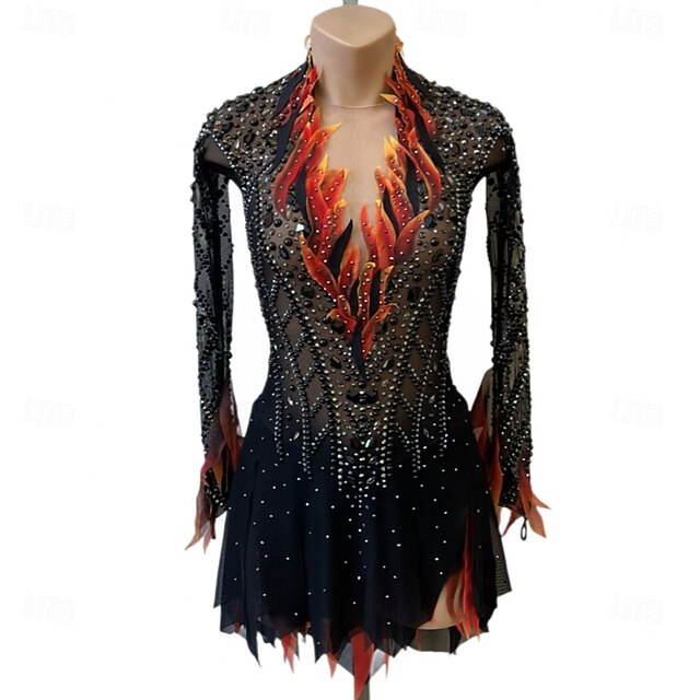 More information about Figure Skating Dress Women's Girls' Ice Skating Dress Black Red Patchwork Open Back Mesh High Elasticity Training Competition Skating Wear Classic Crystal / Rhinestone Long Sleeve Ice Skating Figure