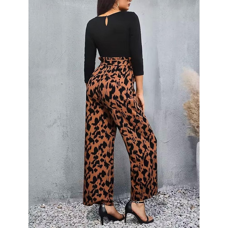 Highlights [Fabric] : Crafted from high-quality spandex, this women's jumpsuit offers a comfortable and breathable experience. The fabric provides a soft touch and relaxed fit, ensuring all-day comfort for spring and fall wear. [Fit and Style] : This chic jumpsuit features a regular fit, combining style and comfort effortlessly. The sleek, fitted top complements the high-waisted, wide-leg silhouette of the pants, creating an elegant yet trendy look that's perfect for fashion-forward individuals. [Design Highlights] : The standout design showcases a bold leopard print pattern in rich hues of brown and black on the high-waisted paper bag pants, complete with a matching tie belt that enhances the silhouette. A black crocodile-patterned handbag and sleek black open-toe high heels complete the ensemble with an extra layer of elegance. [Occasions] : Ideal for casual daily outings and semi-formal events, this jumpsuit exudes a refined yet relaxed confidence, making it a versatile choice for various settings. [Size Range] : Available in sizes S, M, L, XL, and 2XL, ensuring a suitable fit for a range of body types.