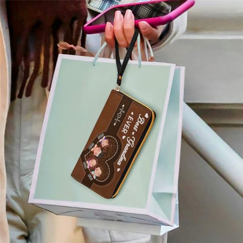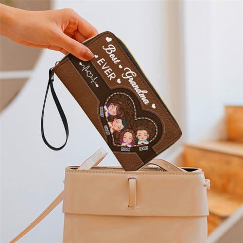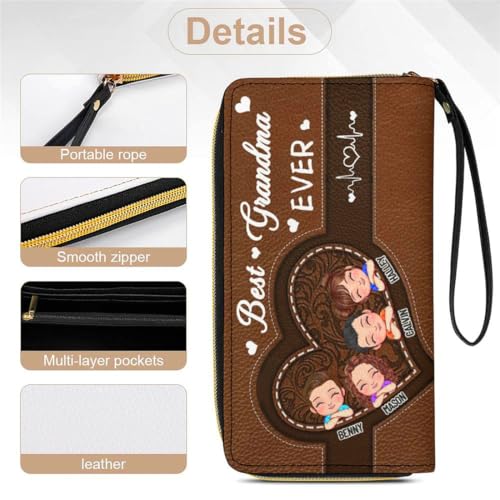 HOT ! Personalized Mothers Day Women Large Capacity Long Wallet Custom Family Names Portraits Best Grandma Ever Leather Zipper Long Wallet Gift for Birthday Valentine's for Mother Nana Grandmother