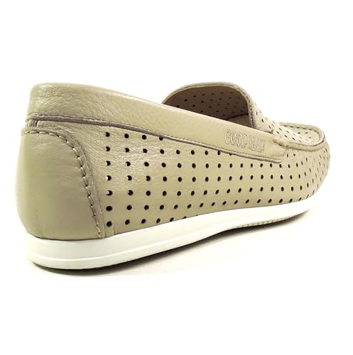 Men's Perforated Leather Loafers, Soft Beige, Comfort Slip-On Summer Shoes with White Sole, Size 42 EU 4