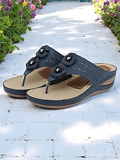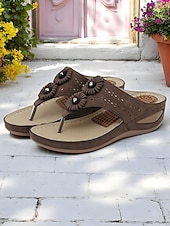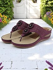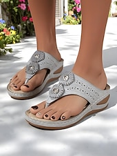 More information about Women's Flower Embellished Flip Flop Sandals – Grey Wedge Design with Massage Insole, Breathable and Stylish for Courtyard Relaxation