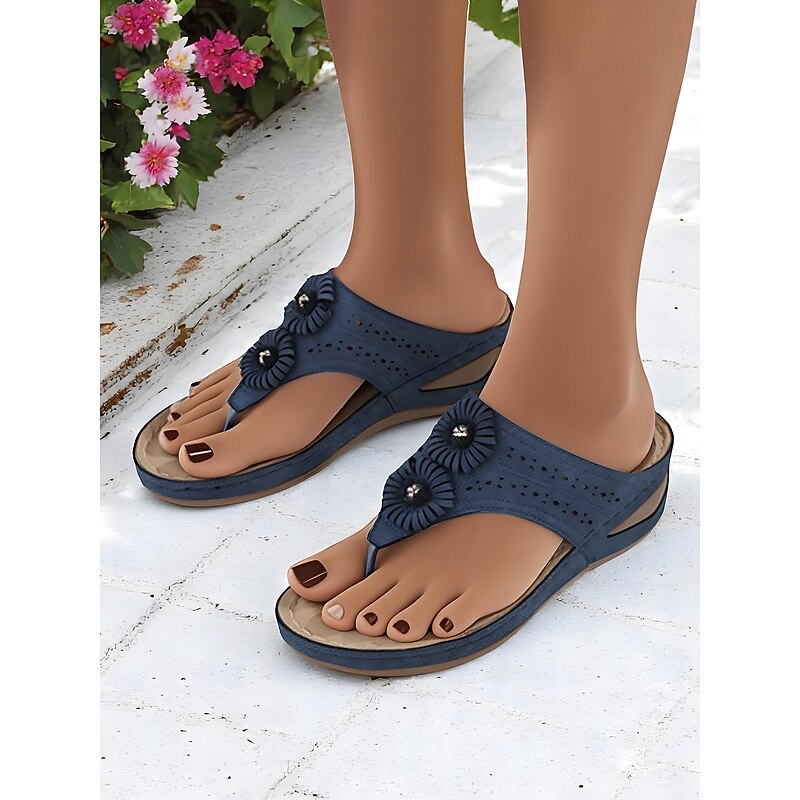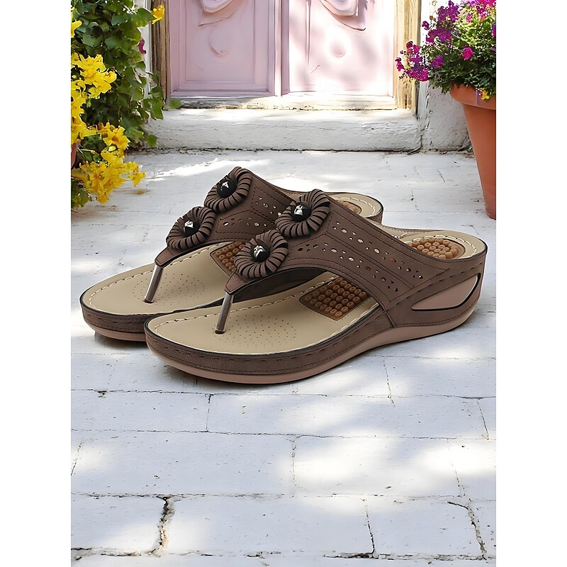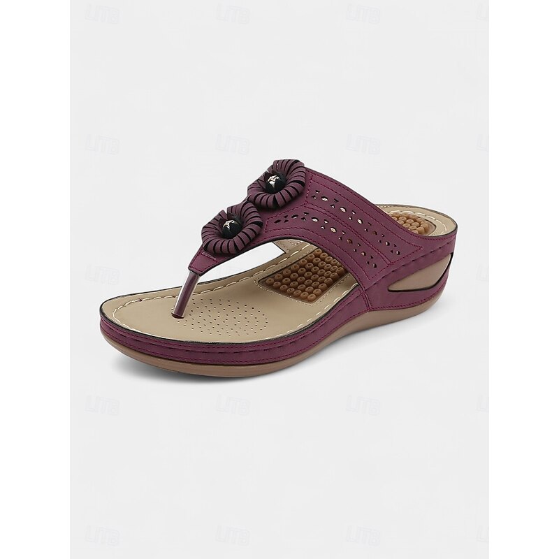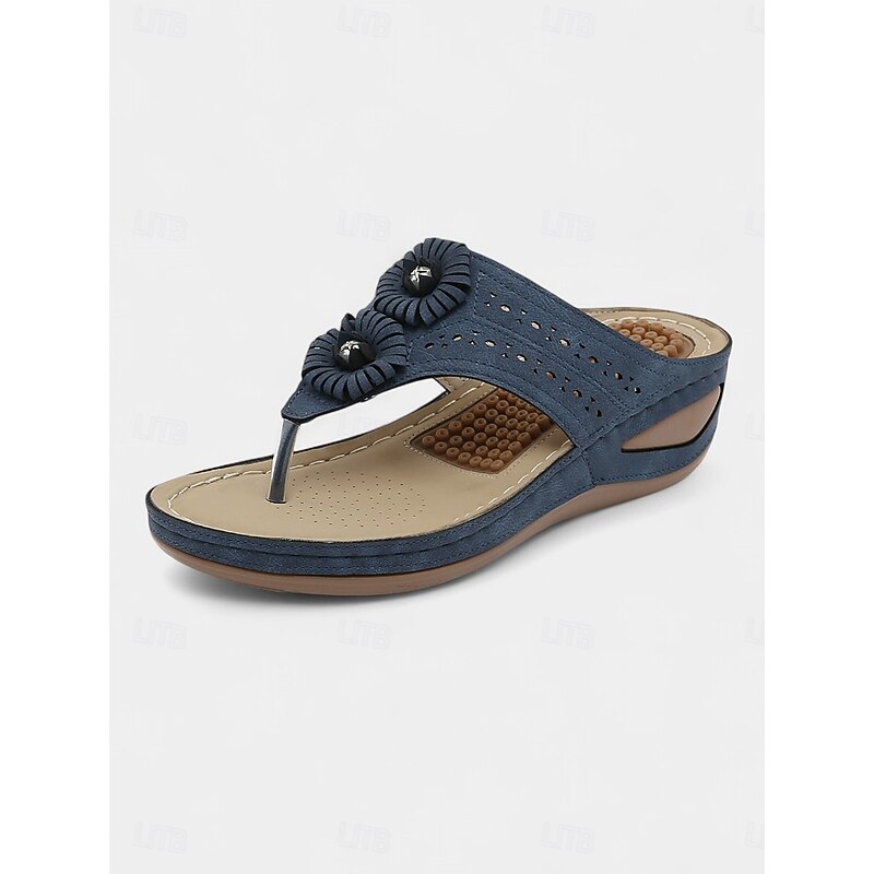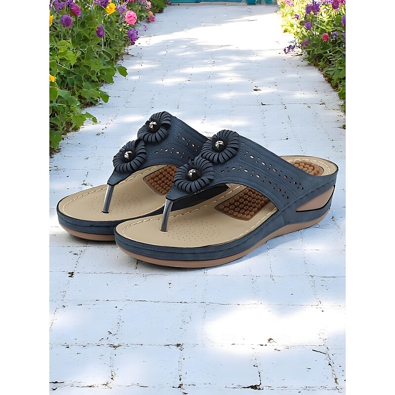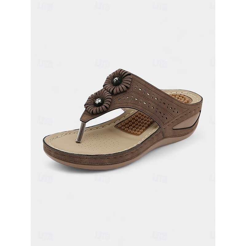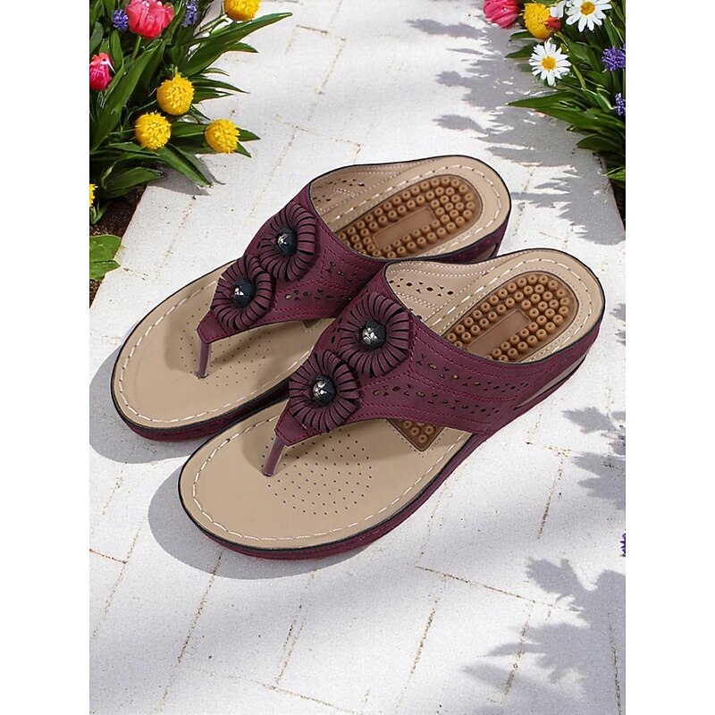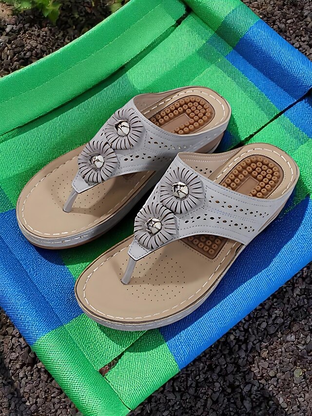 HOT ! Women's Flower Embellished Flip Flop Sandals – Grey Wedge Design with Massage Insole, Breathable and Stylish for Courtyard Relaxation