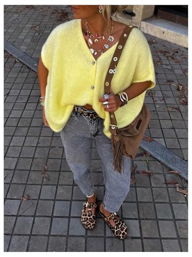 HOT ! GORGLITTER Women's Oversized Button Up Cardigan Sweaters Short Sleeve V Neck Casual Fall Knit Tops Trendy 2025