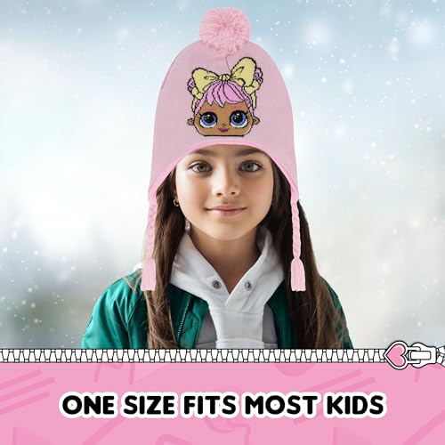 • LOL GIRLS KNIT CAP: Cute and stylish L.O.L Girls skull cap and matching glove set with pom, tassels, and a pink glitter design on the earflap beanie; features Dawn printed on the front of the cap