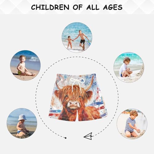 HOT ! Boys Swim Trunks Highland Cow Cattle American Flag Toddler Swim Shorts Beach Board Shorts Swimsuit