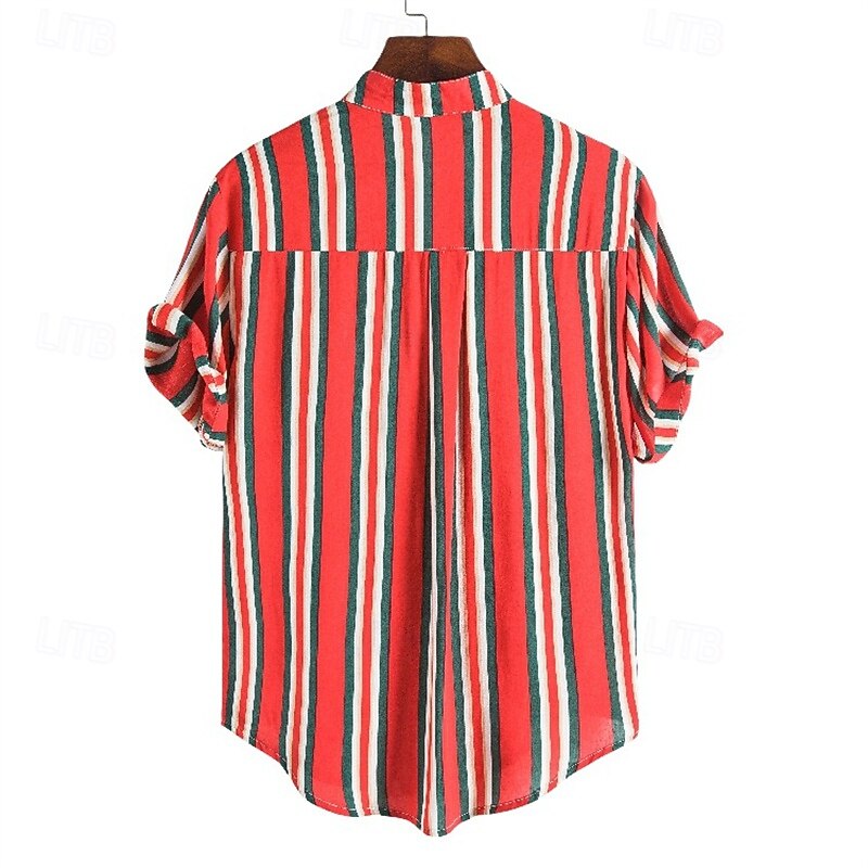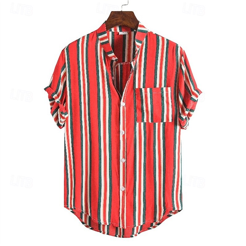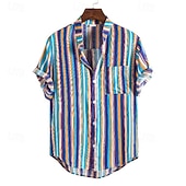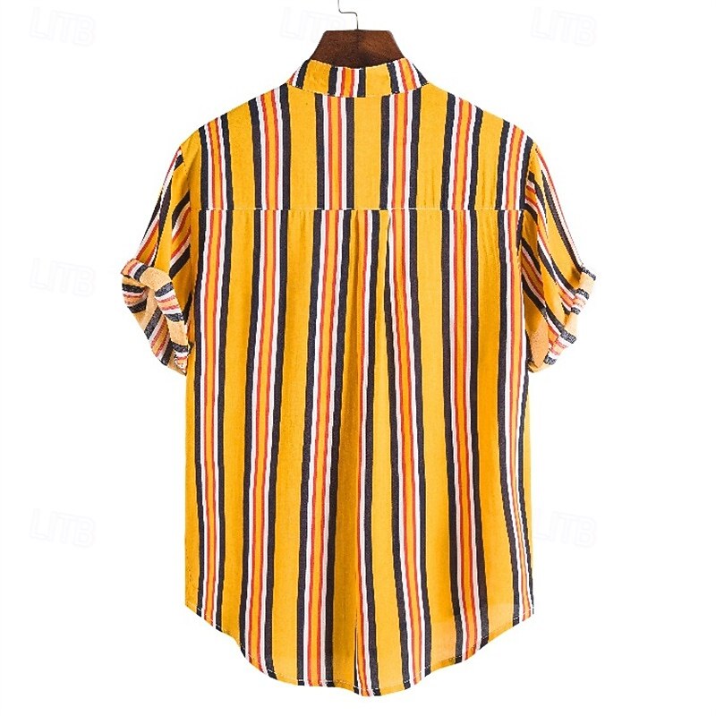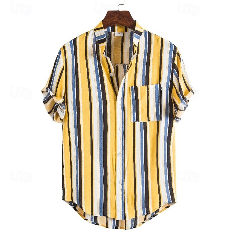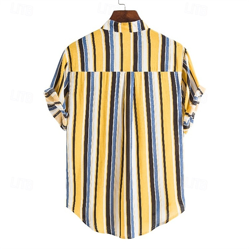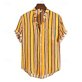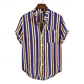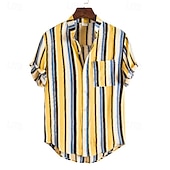 More information about Men's Shirt Popover Shirt Summer Shirt Casual Shirt Beach Shirt Light Yellow Yellow Red Blue Dark Blue Short Sleeve Stripes Band Collar Vacation Hawaiian Pocket Clothing Apparel Cotton Blend Fashion