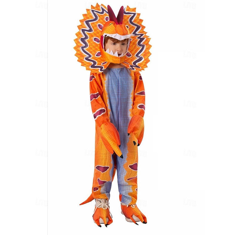 This imaginative costume features a hood designed to resemble a dinosaur's head, complete with realistic eyes and teeth, adding an authentic prehistoric touch. The impressive frill around the neck draws inspiration from frilled lizards, and the costume includes a long tail for added flair. Sleeves and legs end in claw-like extensions, enhancing the realistic dinosaur appearance.