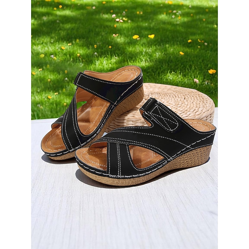 Highlights 1. High-quality faux leather upper materials for a luxurious look and feel 2. Versatile round toe design for a classic and comfortable fit 3. Stylish open toe shape for a modern and fashion-forward look 4. Durable rubber outsole materials for long-lasting wear 5. Stay ahead of the 2024 trends with trendy wedge sandals style.