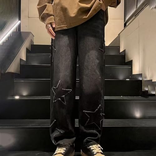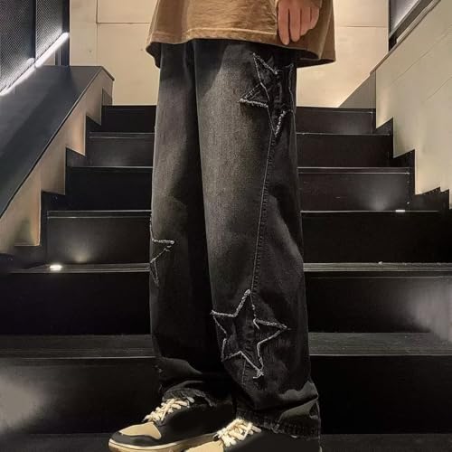 HOT ! Cambkatl Men's Baggy Stars Graphic Jeans Wide Leg Casual Loose Fit Streetwear Denim Pants with Pockets