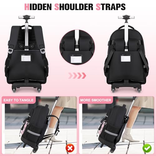 Rolling Backpack for Girls - Roller Wheels School Bookbag with Lunch Bag & Pencil Pouch for Teen Girls Kids Wheeled Suitcase Backpacks, Elementary Middle School Travel Daypack (Black) 6
