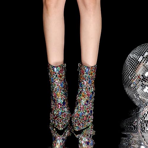 Women's Rhinestone High Heel Boots,Glitter Side Zipper Ankle Boots Sparkly Cowgirl Pointed Toe Stiletto Heel Party Prom Boots 4