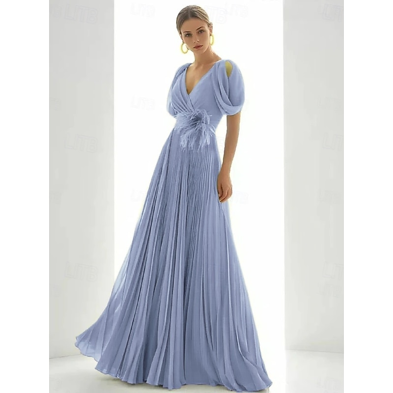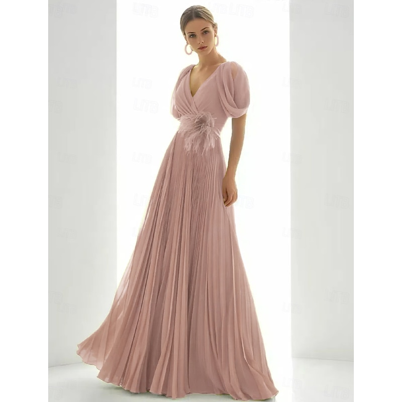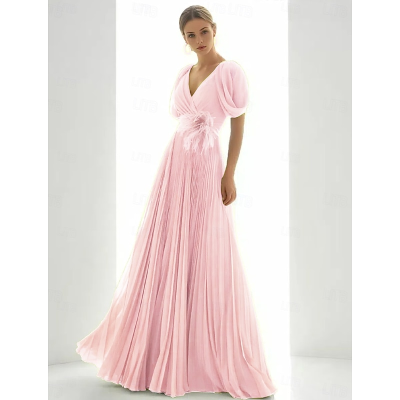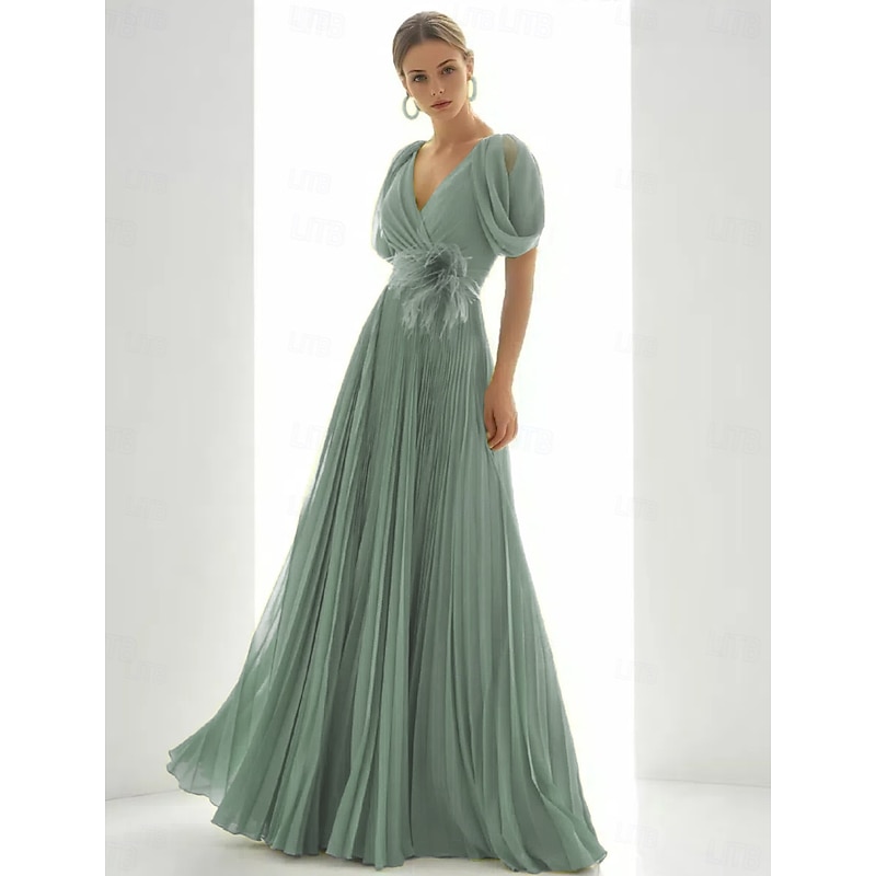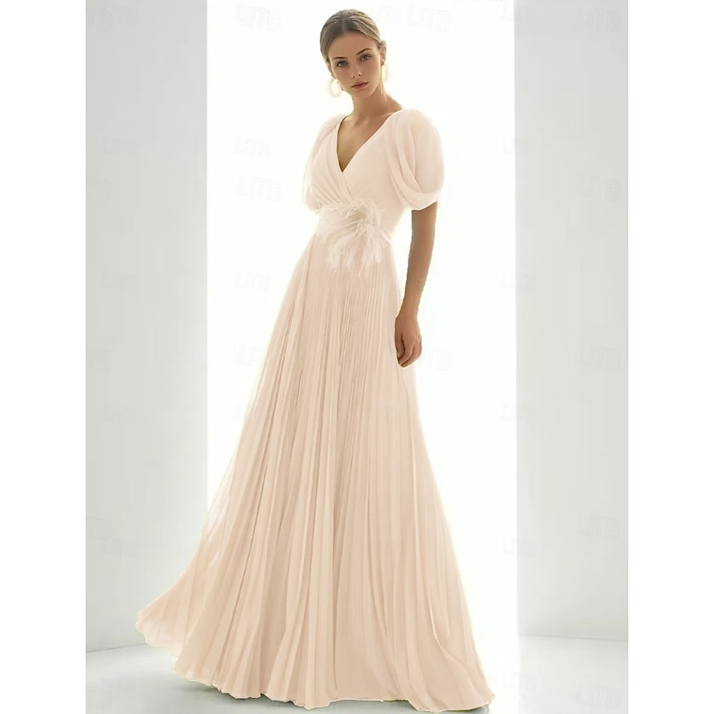 More information about A-Line Evening Gown Elegant Dress Beach Wedding Formal Floor Length Short Sleeve V Neck Chiffon with Feather Ruched