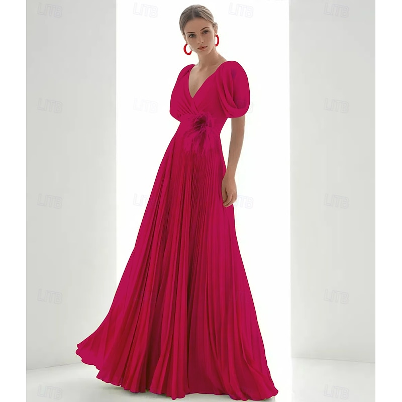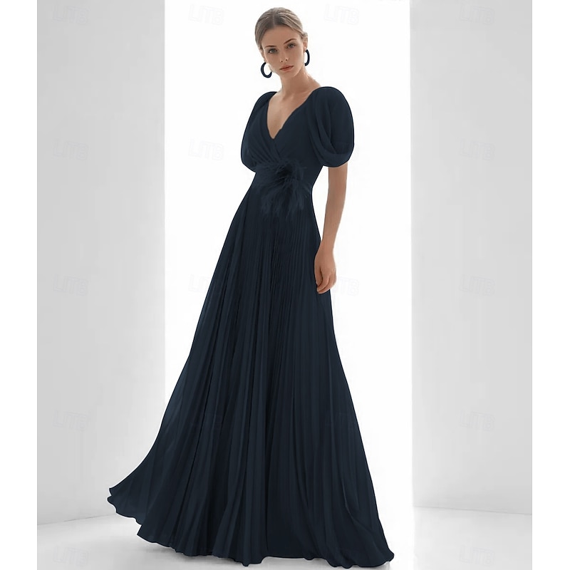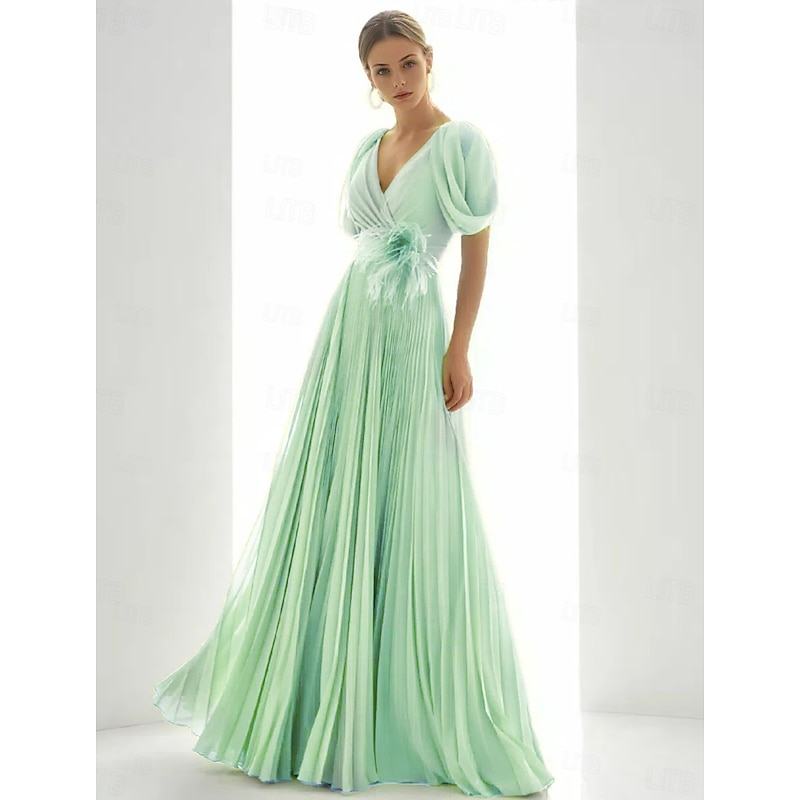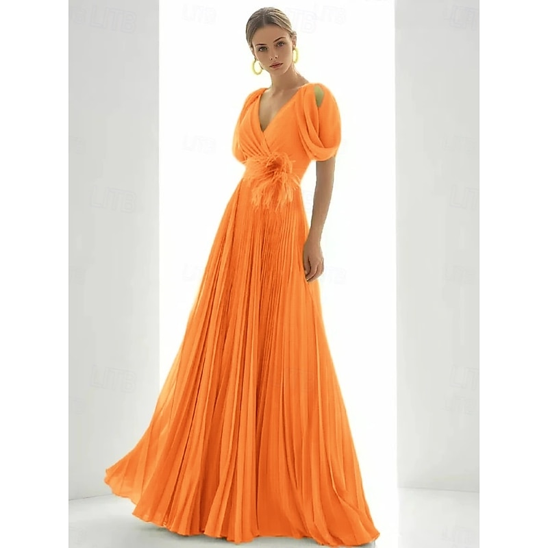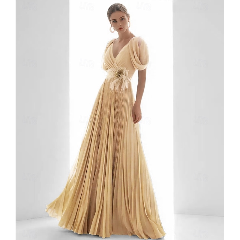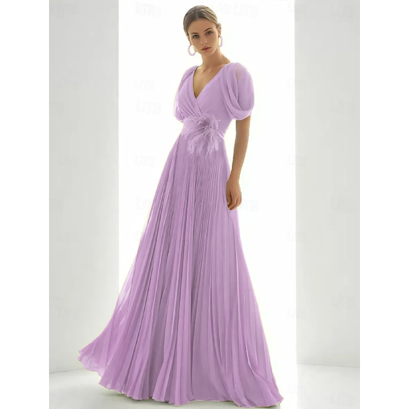 More information about A-Line Evening Gown Elegant Dress Beach Wedding Formal Floor Length Short Sleeve V Neck Chiffon with Feather Ruched