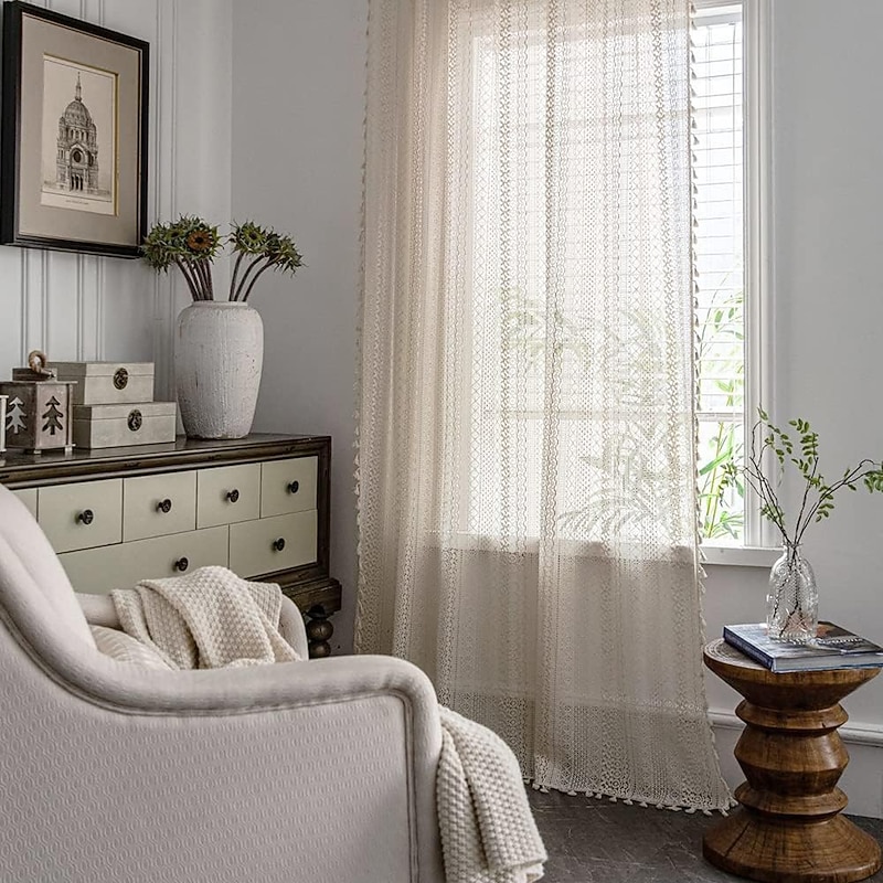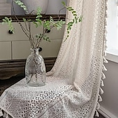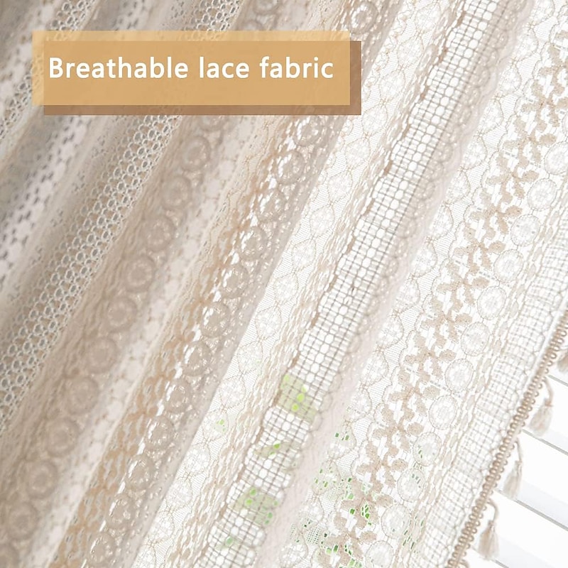 Featuring stylish beige tassels and intricate openwork needle hooks, these curtains offer a light and clean aesthetic. The threaded rod design adds simplicity and beauty, enhancing room decor while softening the ambiance and ensuring privacy.