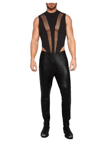 HOT ! Floerns Men's Contrast Mesh Sleeveless Jumpsuit Mock Neck Club Bodysuit Leotard