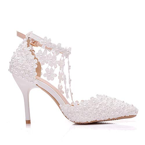 More information about Women's White Lace Floral Stiletto High Heel Wedding Shoes, Sexy Pointed Closed Toe Bridal Heels Sandals, Ankle Strap Party Dress Bride D'Orsay Pumps