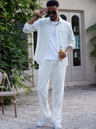 WEEN CHARM Mens Shirts Casual 2 Piece Long Sleeve Button Down Cuban Shirt and Pants Set Summer Beach Outfits 2