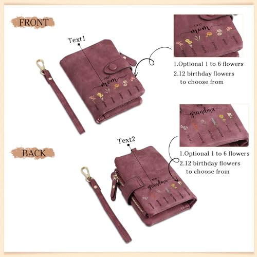 Prsonalized Names Wallet with Birth Flowers for Women - Custom 2-12 Names Text with Birth Flowers Wallet Mom Gifts for Mother's Day Birthday First Mom at this moment Grandma Gifts (color 2)